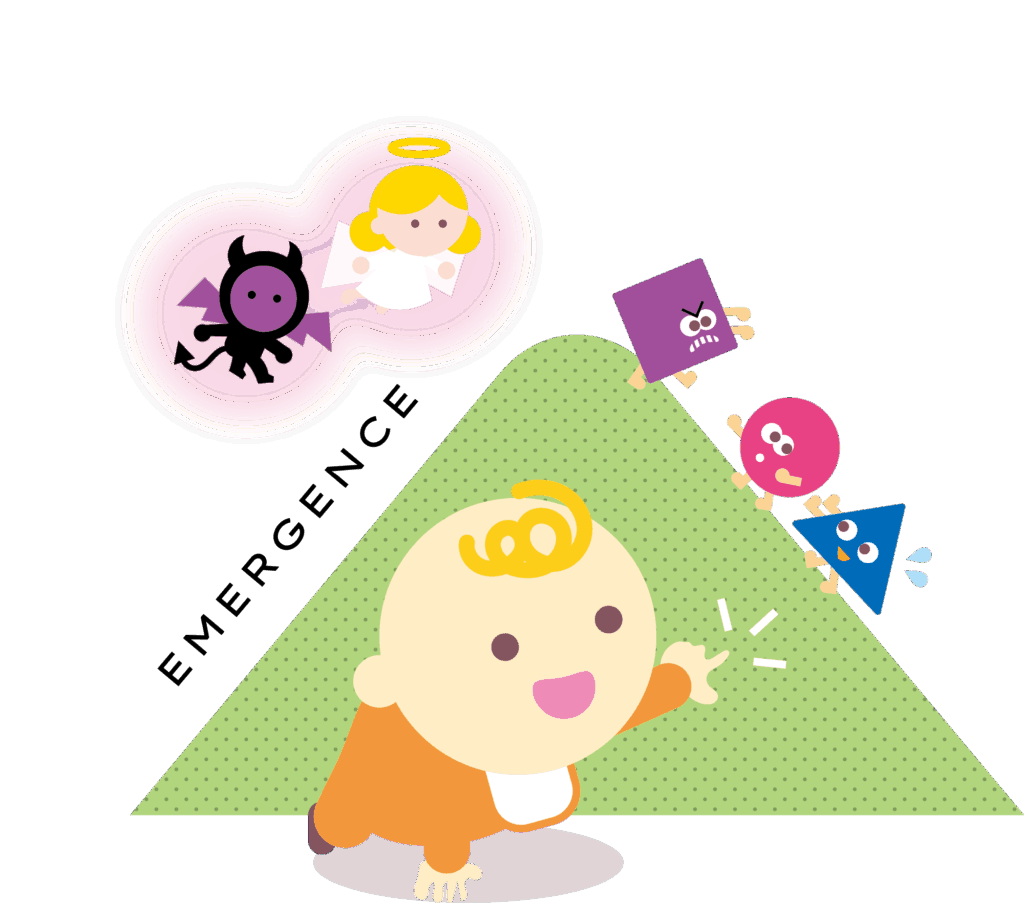 ある実験で、生後6カ月の赤ちゃんに坂を上ろうとする丸い図形を見せた後、その動きを助ける三角形と、邪魔をする四角形の映像を見せました。最後に三角形と四角形を並べて赤ちゃんに選ばせると、赤ちゃんは「助けた」図形に手を伸ばしました。図形の配置を変えても結果は同じ。子どもは興味のあるものや好きなものを手に取ろうとするものなので、助けてくれる良い人の方を選ぶという、善悪の基本がすでにこの時期から芽生えているのです。